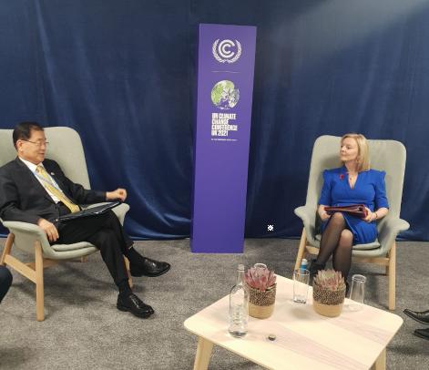 트러스 장관은 한국이 금번 총회에서 2030 국가 온실가스 감축목표(NDC)를 40%로 상향하는 공약을 발표한 것을 평가하고, 기후변화 및 코로나19 대응 등 범세계적 현안에 대한 한국과의 지속적인 협력을 희망했다.