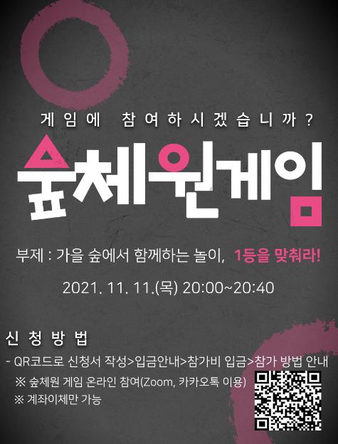 이번 이벤트는 숲과 자연에 관심있는 누구나 화상회의시스템(ZOOM)을 통해 참여할 수 있으며, 가을 숲에서 자연물로 할 수 있는 놀이를 세계적 열풍을 일으킨 ‘오징어게임’과 비슷한 방식으로 즐길 수 있도록 구성됐다.