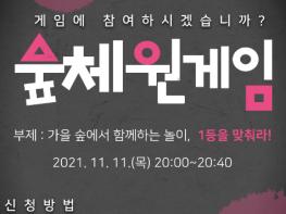 횡성군은 산림청 한국산림복지진흥원 소속기관인 국립횡성숲체원에서 11월 11일 비대면 실시간 ‘숲체원 게임’ 이벤트를 진행한다고 밝혔다.