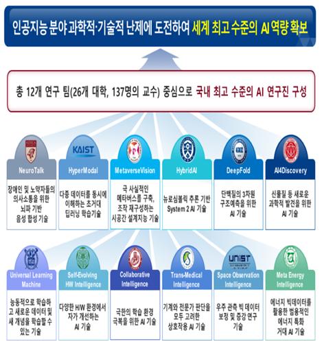 과기정통부는 정부와 민간에 축적된 인공지능 연구 역량을 모으고, 컴퓨팅 파워 등 인프라를 연계하여 세계적 수준의 경쟁력을 갖춘 국가 연구체계를 갖추기 위해 AI혁신 허브를 구성했다.