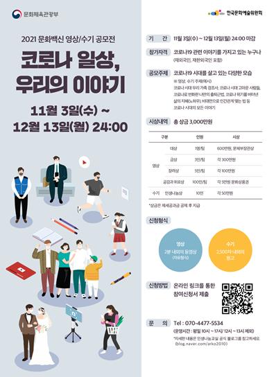 문화체육관광부는 한국문화예술위원회와 함께 코로나19 시대를 사는 다양한 모습들을 담은 영상과 수기를 11월 3일부터 12월 13일까지 공모한다.