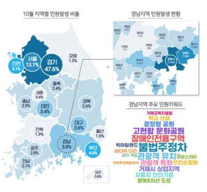 전월 대비 민원이 가장 많이 증가한 지역은 경남으로, “문화공원 및 인공해변 조성 관련 찬반 의견” 등으로 인해 전월 대비 2.6% 증가했으며, 경남 지역 중에서는 창원시에 가장 많은 민원(13,480건)이 접수됐다.