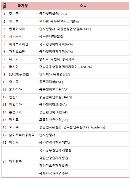 국가공무원인재개발원은 8~11일까지 영국, 유럽연합집행위원회(EU Commission), 중국 등 19개국 33명의 공공인재개발 담당자들이 참가하는 '국가인재원 인적자원개발 전문가 토론회(NHI HR 리더스 포럼)'를 개최한다고 7일 밝혔다.