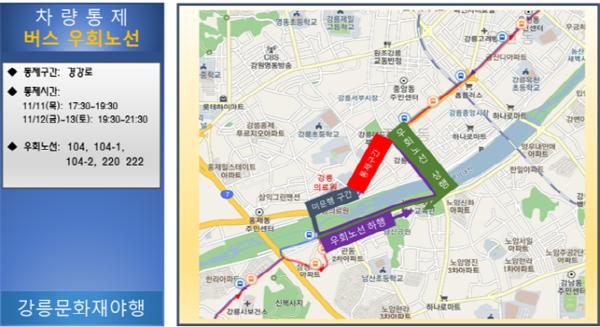 강릉시는 강릉문화재 야행 행사에 따른 일부 구간 교통통제로 인해 해당 구간에서 운행되고 있는 시내버스를 일시적으로 우회하여 운행한다고 밝혔다.