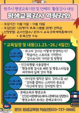 원주시 평생교육원 학습관은 원주지역 평생교육기관 및 단체에서 활동하는 강사를 대상으로 평생교육강사 역량강화 프로그램을 운영한다.