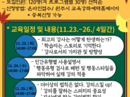 ‘최고의 강사는 어떻게 탄생하는가?’, ‘인간유형별 사용설명서’, ‘더 이상의 법칙은 없다. 강의스킬 UP!’, ‘문해교육과 평생교육 등 총 4강좌를 11월 23일부터 26일까지 4일간 학습관에서 대면 강의로 진행한다.
