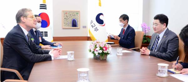 최종건 외교부 제1차관은 11.12. 5년간의 한국 근무를 마치고 이임하는 리누스 폰 카스텔무르(Linus Von Castelmur) 주한 스위스 대사를 접견하였다.