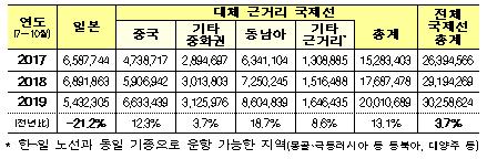 그 결과, 실제 7~10월간의 항공여객실적도 일본의 경우 전년동기 대비 21.2% 감소했음에도 불구하고 대체지역의 항공실적 상승이 이를 상쇄함에 따라 전체적으로는 국제선 여객이 3.7% 증가하는 등 노선 다변화의 효과가 나타나고 있다.