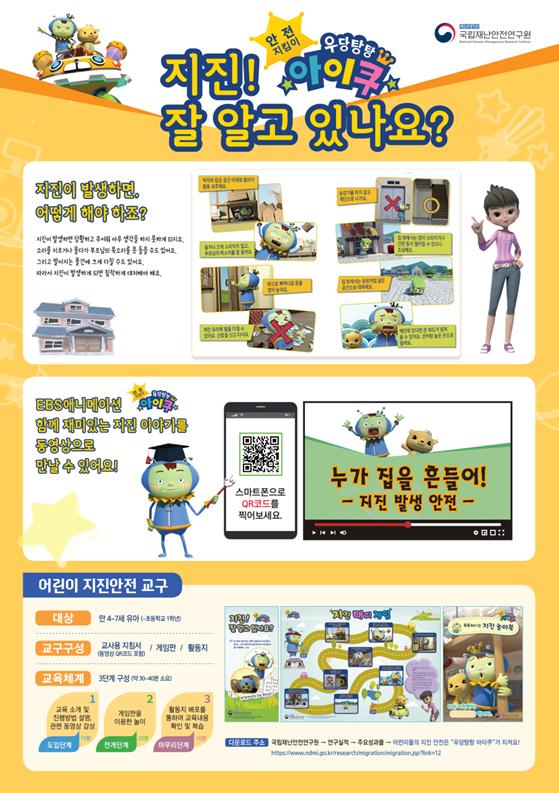 행정안전부 국립재난안전연구원은 평소 어린이들이 재난안전 교육을 통하여 재난 발생 시 스스로 자신을 보호할 수 있도록 EBS 만화 인물 ‘안전지킴이 우당탕탕 아이쿠’를 활용한 지진재난 안전 교구를 개발하였다고 16일 밝혔다.