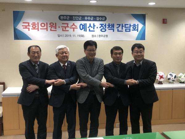 안호영 의원과 박성일 완주군, 황인홍 무주군수, 장영수 장수군수, 최성용 진안군수 권한대행은 지난 19일 완주군청에서 예산·정책 간담회를 가졌다.