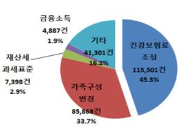 이의신청 사유는 ‘건강보험료 조정’이 115,501건(45.3%)으로 가장 많았고, ‘출생 등 가족구성원 변경’ 85,868건(33.7%), ‘재산세 과세표준 이의’ 7,398건(2.9%) 순이었다.