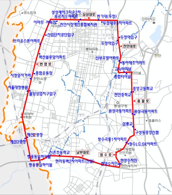 반시계방향으로는 한기대(두정)~시청앞사거리~패션2광장~한양수자인~구성동중앙신협~중앙고~고속터미널~동아태조아파트~두정역 입구까지 이어진다.