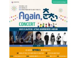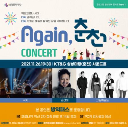 춘천문화재단은 오는 11월 26일 저녁 7시 30분 KT&G 상상마당 춘천 사운드홀에서 위드코로나 시대를 맞아 시민의 일상 회복을 기원하는 [Again, 춘천] 콘서트를 개최한다.
