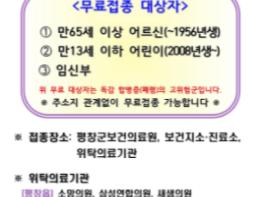 평창군은 현재 만 65세 어르신, 만 13세 이하 어린이, 임신부를 대상으로 독감 무료 예방접종을 진행하고 있다.