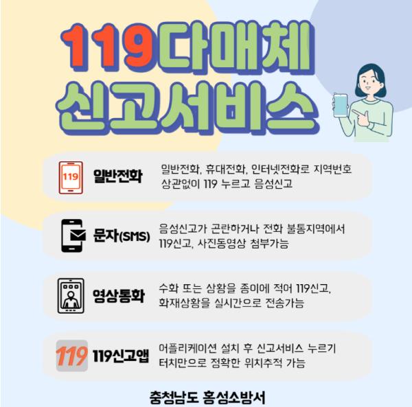 홍성소방서는 재난 발생 시 음성 외에도 문자, 앱(App), 영상통화 등을 이용하여 신고가 가능하다고 전했다.