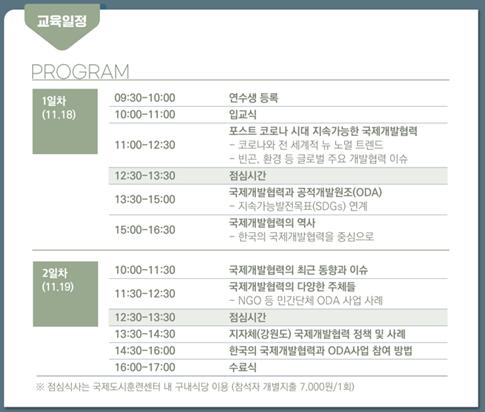 대면 집합교육으로 진행되는 이번 교육은 ▲포스트 코로나 시대 지속가능한 국제개발협력 ▲국제개발협력과 ODA ▲국제개발협력 역사 ▲국제개발협력의 다양한 주체들 ▲지자체 국제개발협력 정책 및 사례 ▲한국의 국제개발협력과 ODA 사업 참여 방법 등을 주제로 하며, 외교부 및 코이카 등에서 근무한 현장경험이 풍부한 강사진이 대거 참여한다.