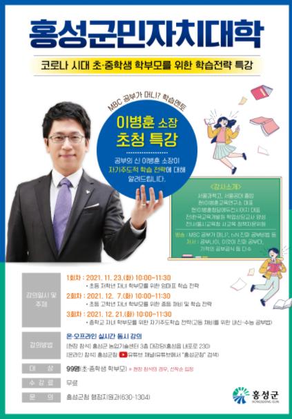 홍성군이 오는 23일 10시 농업기술센터 대강당에서 홍성군민자치대학 개강식을 갖고 ‘코로나 시대 초․중학생 학부모를 위한 학습전략’을 주제로 이병훈 강사를 초빙해 특강을 진행한다.