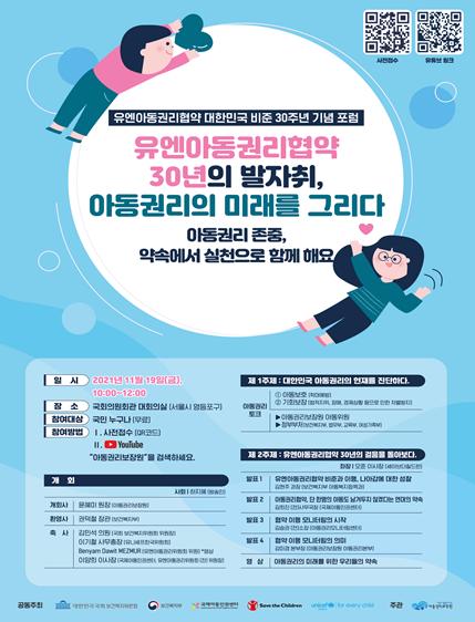 보건복지부는 우리나라가 아동의 권리에 관한 가장 보편적인 국제협약인 「UN 아동권리협약」을 비준(1991.11.20.)한지 30주년이 되는 해를 맞아, 보건복지위원회(위원장 김민석)·국제아동인권센터(이사장 이양희)·세이브더칠드런(이사장 오준)·유니세프 한국위원회(회장 정갑영)와 공동주최하고, 아동권리보장원(원장 윤혜미)이 주관하여 11월 19일 오전 10시 서울 영등포구 국회 의원회관 대회의실에서 ‘UN 아동권리협약 대한민국 비준 30주년 기념 포럼’을 개최했다.