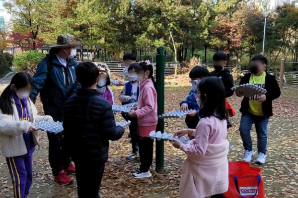 낙엽 공놀이, 계란판으로 씨앗 옮기기 등 생태놀이와 함께 양서류의 겨울잠 이야기부터 나무의 겨울나기까지 숲의 겨울나기를 주제로 수업했다.