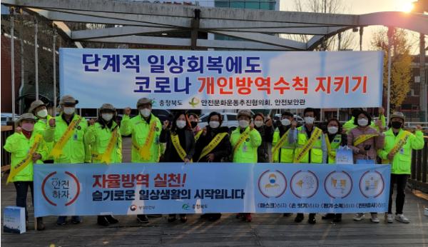 충북도는 11월 19일 17시 옥천군 공설시장 일원에서 충북도 및 옥천군, 안전보안관 회원 등 25명이 참석한 가운데 옥천군과 합동으로, 코로나 자율방역‧자율실천 관련 안전문화 홍보 캠페인을 펼쳤다.