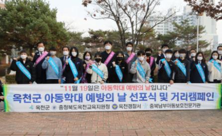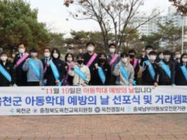 군은 지난 19일 아동학대 예방의 날을 맞아 옥천여자중학교 앞 향목원에서 아동학대 예방에 대한 지역 주민들의 관심을 높이고 아동학대 신고 및 근절에 적극적인 동참을 호소하고자 ‘아동학대 예방의 날 선포식’을 개최했다.