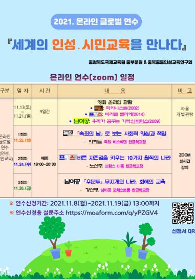 충청북도국제교육원 중부분원은 온라인 글로벌 연수로 「세계의 인성·시민교육을 만나다」을 11월 22일 실시하였다.