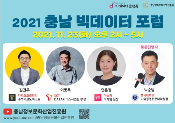 충남정보문화산업진흥원이 23일 진흥원 유튜브 채널을 통해 2021 충남 빅데이터 포럼을 개최한다고 밝혔다. 이번 포럼은 코로나19 확산 방지를 위해 비대면으로 진행된다.