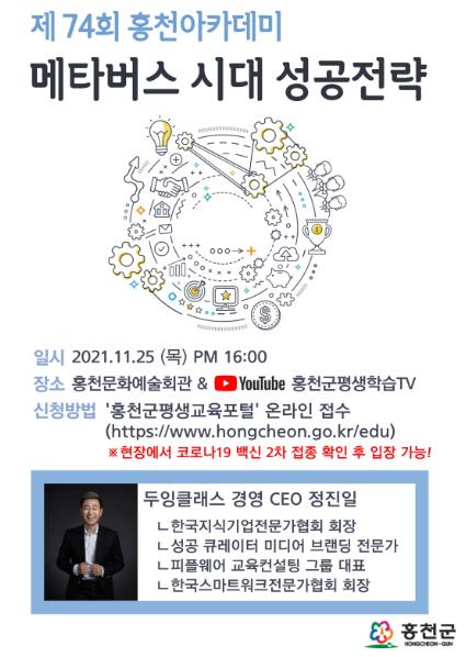 홍천군이 11월 25일 오후 4시 홍천 문화예술회관에서 제74회 홍천아카데미 ‘메타버스 시대 성공전략’을 운영한다.