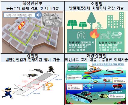 또한 경찰청은 안전한 범인 검거를 위한 현장지원 장비 개발 미래형 국민치안 서비스 개발 등 3개 신규과제에 29억원을 투자하고 해경청은 수상구조사 스마트 지원장비 개발 위성기반 선박모니터링 및 불법 활동 선박 탐지체계 개발 등 5개 신규과제에 35억원을 투자한다.