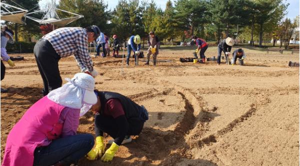 청주시는 내년 봄을 맞이하기 위해 문암생태공원과 무심천에 22만본의 튤립 구근을 식재하는 데 구슬땀을 흘리고 있다.