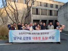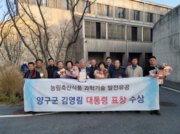 지난 18일 농촌진흥청 주관으로 전북 고창 상하농원 파머스빌리지 강당에서 열린 2021년 기술보급사업 종합평가회에서 김영림(양구군 국토정중앙면 가오작리) 씨가 농림축산식품 과학기술 발전 유공 분야 대통령 표창을 수상했다.
