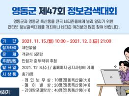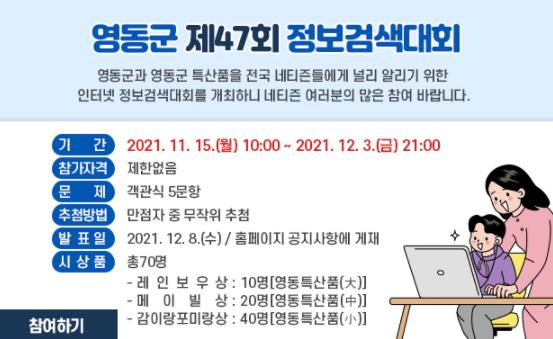 충북 영동군은 오는 12월 3일까지 군민과 전국 네티즌을 대상으로 ‘제47회 영동군 인터넷정보검색대회’를 개최한다고 밝혔다.