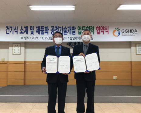 (재)금산인삼약초산업진흥원은 22일, 삼남제약(주) 회의실에서 양 기관 대표와 임직원이 참석한 가운데 ‘지역특화작물을 활용한 고부가가치 의약품 및 식품소재 개발의 공동 협력’에 대한 포괄적 업무협력에 합의하고, 건강기능식품 및 원료의약품분야 제품화 공정개발을 위한 실무네트워킹을 강화했다.