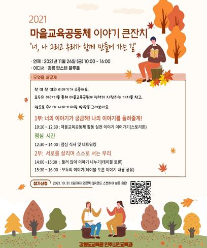 강원도교육청은 26일 오전 10시, 강릉 탑스텐에서 ‘마을교육공동체 이야기 큰잔치’를 개최한다.