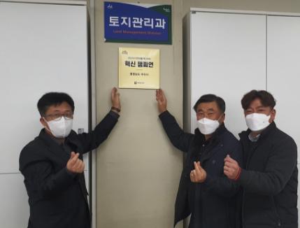 아산시 토지관리과가 지난 24일 행정안전부 주관 2021년 주민생활 혁신사례 혁신 챔피언 현판 제막식을 가졌다.