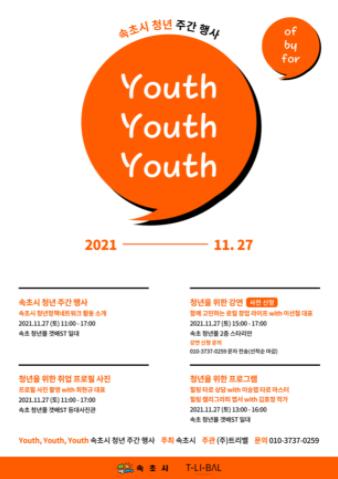 속초시가 청년 간 교류 및 소통문화를 활성화하고 청년들을 응원하기 위해‘2021 속초시 청년주간행사’를 11월 27일 청년몰 속초, 갯배st 에서 개최한다.
