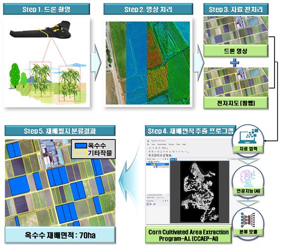 옥수수 재배면적 추출 프로그램은 면 단위(4,000헥타르) 이상의 넓은 지역을 촬영한 뒤 농경지 전자지도를 이용해 농경지만 추출하고, 인공지능 분석으로 재배면적을 자동으로 추출해 주는 소프트웨어다.