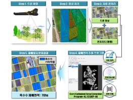 옥수수 재배면적 추출 프로그램 작업은 ① 옥수수 재배지역 드론촬영 ② 영상정합 ③ 자료 전처리 ④ 재배필지 추출 ⑤ 재배면적 확인 순서로 진행된다.