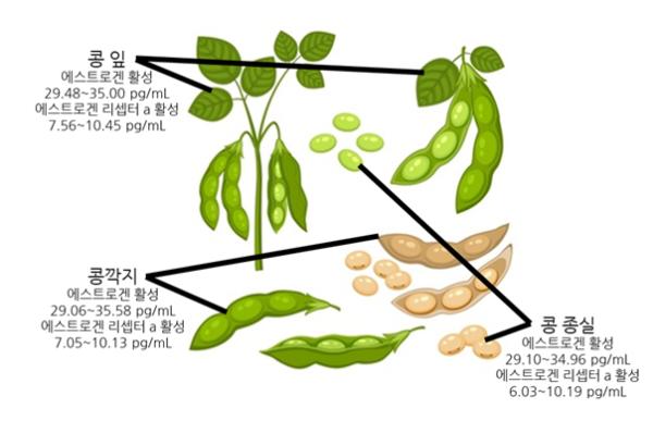 측정 결과, 폴리페놀 함량은 최대 519.13mg GAE/g, 플라보노이드 함량은 최대 3,180.00mg CAE/g였고, 에스트로겐과 에스트로겐 리셉터 알파 활성은 각각 최대 35.58pg/ml, 10.13pg/ml였다. 이는 콩 종실(씨알)의 추출물과 비슷한 수치다.