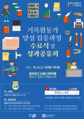 청주시와 청주시문화산업진흥재단 문화도시센터가 오는 12월 3일 오후 2시 동부창고 34동 다목적홀에서 ‘2021 청주 시민 기록활동가 양성 집중과정 수료식 및 성과공유회’를 개최한다.