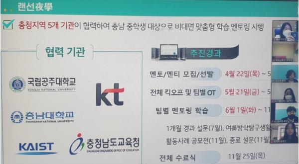 이를 위해 지난 5월에 충남교육청과 KT는 업무협약을 체결하고, 서로 협력체제를 이루었다. 충남교육청 주관으로 선발된 18개 중학교 90명의 멘티 학생은 KT 주관의 공주대, 충남대, 카이스트 멘토 대학생 30명과 3:1의 그룹으로 6개월간 학습을 이어왔다. 실시간 쌍방향 화상수업이 가능한 에듀테크 플랫폼을 활용하여 주 4시간씩 멘티가 희망한 과목에 대해 학습 지원과 상담이 이루어졌다.