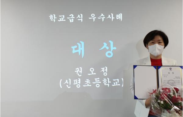 충남교육청은 신평초(당진) 권오정 영양교사가 교육부 주최 2021 학교급식 우수사례 및 국민 아이디어 공모전에서 대상(전국 1등)의 영예를 얻었다고 밝혔다.