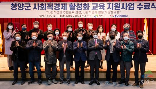 청양군과 충남도립대학교가 지난 25일 충남도립대 해오름관에서 열린 사회적경제 교육과정 수료식을 통해 활동가 22명을 배출했다.