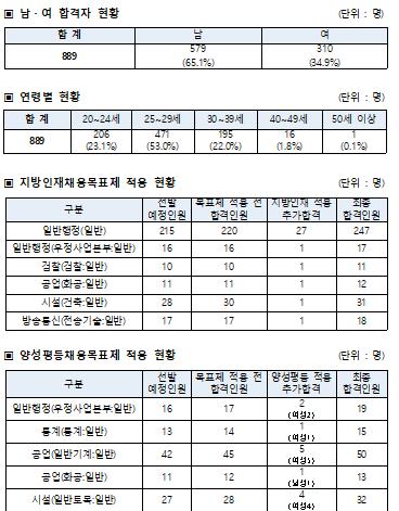 최종 모집 분야별로는 행정직군에서 665명, 기술직군에서 224명이 합격했고, 이 중 장애인 구분모집에 46명이 최종 합격했다.