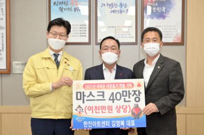 공주시는 지난 26일 한진아트센터(대표 김영복)에서 코로나19로 인한 취약계층에 어려움을 덜어주기 위해 마스크 40만 장(2,000만 원 상당)을 기탁했다고 밝혔다.