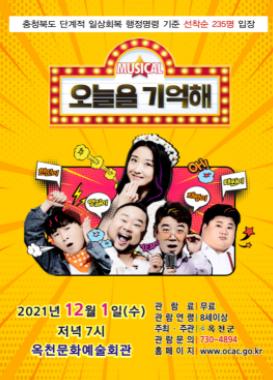 옥천군은 오는 1일 오전 10시와 저녁 7시, 문화예술회관에서 코미디뮤지컬 ‘오늘을 기억해’를 공연한다고 25일 밝혔다.