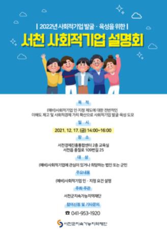 서천군지속가능지역재단은 (예비)사회적기업 발굴을 위해 12월 15일까지 ‘서천 사회적기업 설명회’ 참여자를 모집한다고 밝혔다.