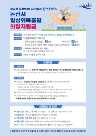 논산시는 오는 12월 1일부터 코로나19의 장기화로 경제적 어려움을 겪고 있는 소상공인, 농업인, 공연예술인 등의 성공적인 단계적 일상회복을 도와줄 ‘일상회복응원 희망지원금’을 신청,접수한다.