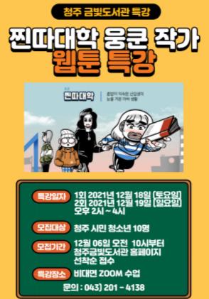 청주 금빛도서관은 지역 웹툰 작가 웅쿤(조웅비)을 초대해 웹툰 작가를 희망하는 사람들을 위한 ‘웹툰 특강’을 운영할 예정이다.
