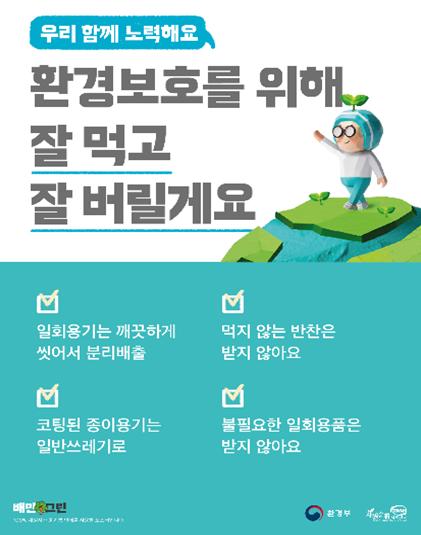 홍정기 환경부 차관은 “먹지 않는 기본 반찬 안받기를 통해 누구나 쉽게 1회용품 사용과 남은 음식물 발생을 줄일 수 있다”라며, “음식배달 주문 시 미래의 환경을 위해 한번 더 생각하는 문화가 일상에서 정착되기를 기대한다”라고 말했다.